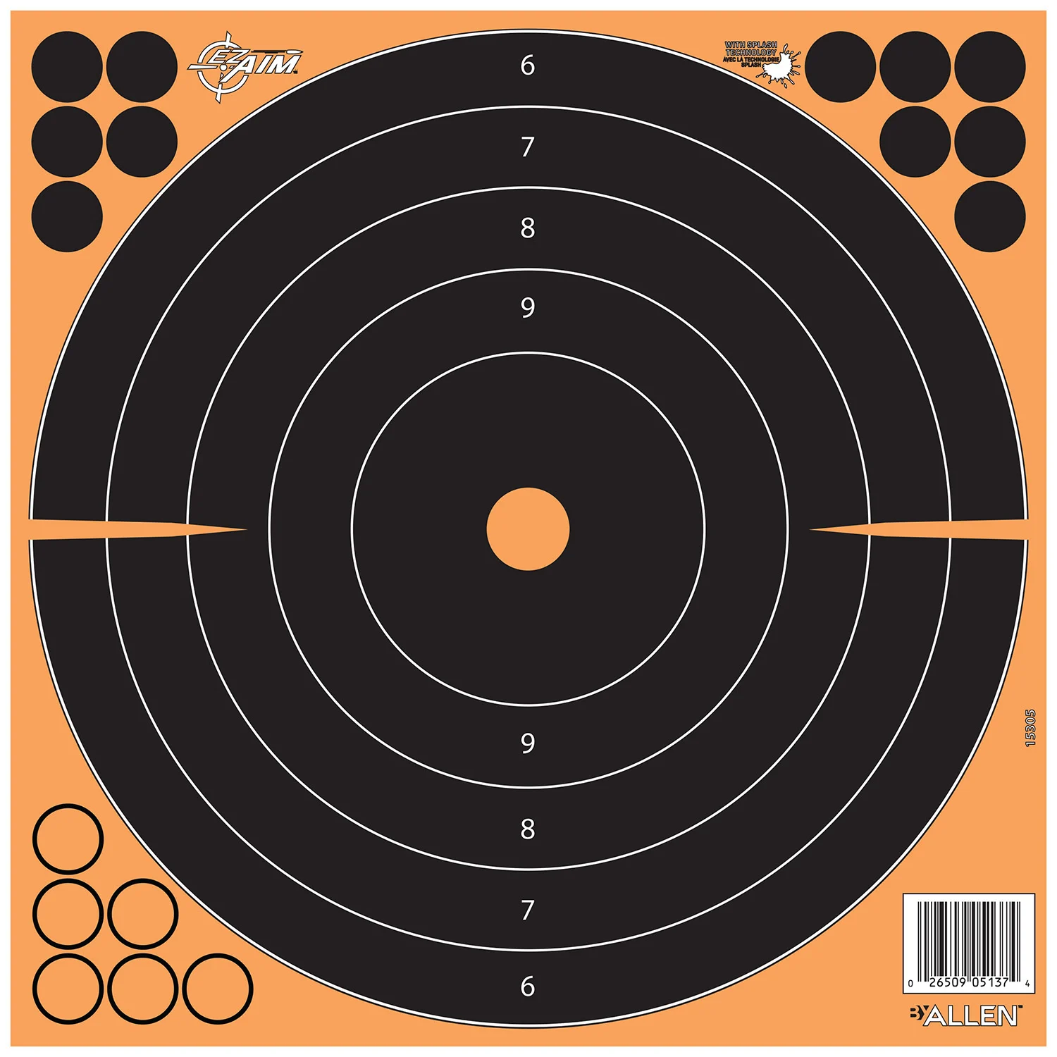 The EZ Aim Bullseye is a great all purpose target. The bound design Keeps targets looking great.. It has concentric rings in a one-inch increments. The bright orange one-inch aiming point is easy to see. Scope aligner hash marks. The target is 12 x 12 inches. Two color print, bright orange color and black print. 100 targets per pack