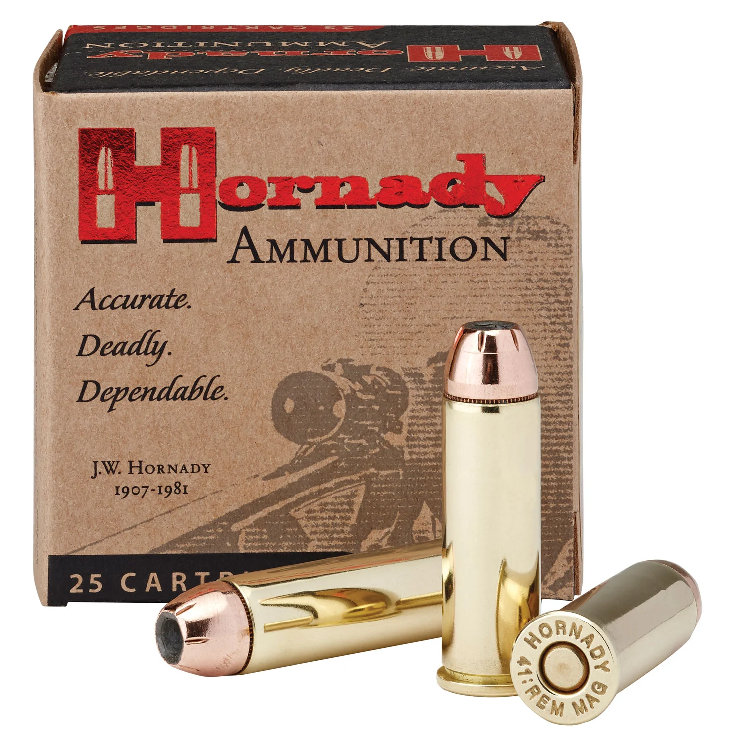 Whether you use your handgun for hunting, competition, or self-defense, Custom Handgun offers the most reliable ammo with the widest range of terminal velocities. Built on a tradition of hand-loaded performance from factory-loaded ammunition, Custom Handgun is inspected to ensure the quality and consistency you expect from Hornady. Cases, primers, and propellants are specifically chosen for superior handgun performance. Specifications: 41 Rem Mag/210 gr/Hornady XTP Hollow Point (XTPHP)/20 Per Box/10 Cs