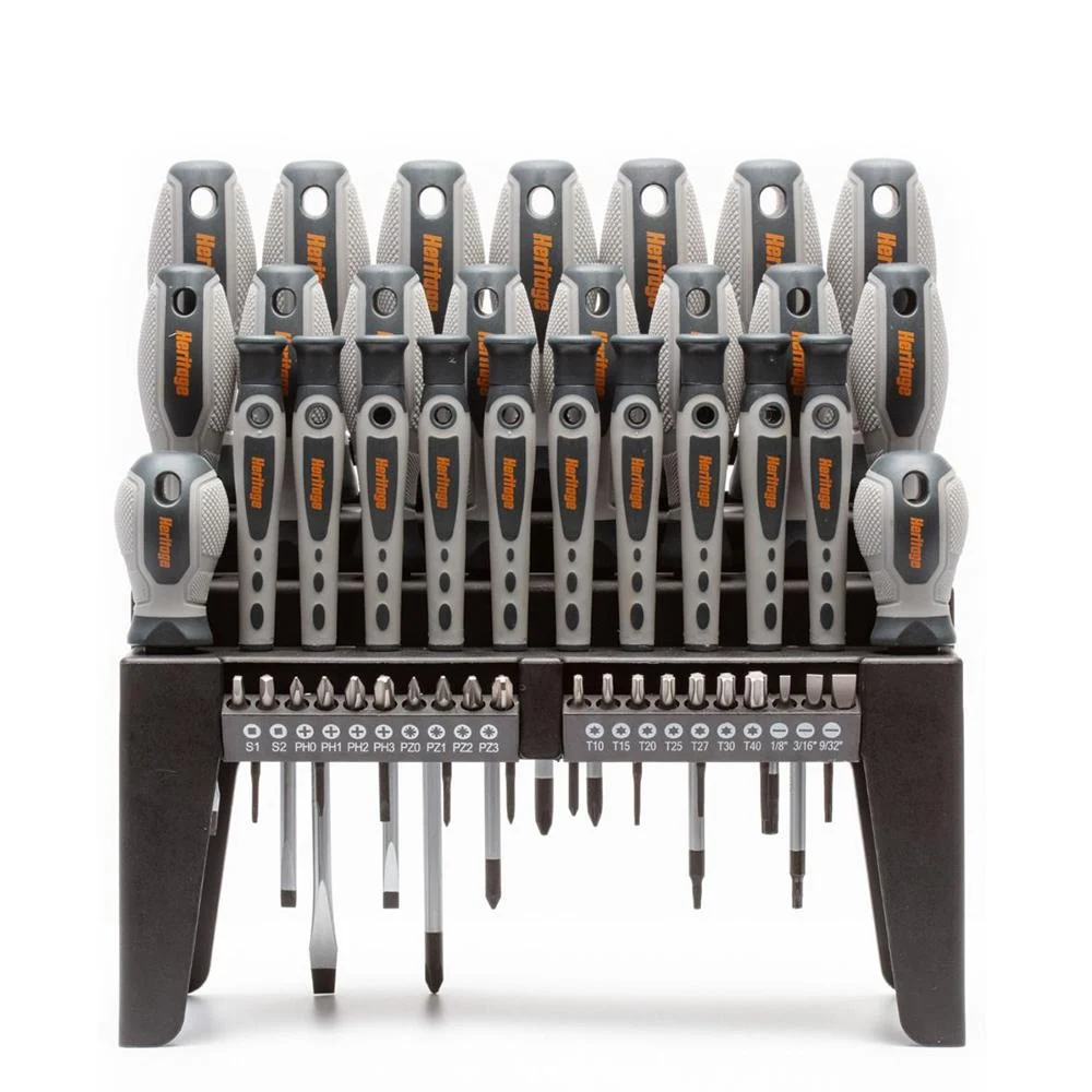 The Heritage series of tools incorporates Lyman’s nearly 150 years of experience producing quality equipment and tools for sportsmen. Our 47 Piece Heritage Screwdriver Set has all the bits needed to tackle most of your firearm outdoor sports household and general maintenance jobs. The drivers are made of tough chrome vanadium steel and equipped with comfortable textured non-slip grips. The straight bits have hollow ground tips for proper non-slip fit in slotted screws. There are 9 fixed blade slotted tip drivers 9 Torx drivers and 8 Phillips drivers. Additionally there is a driver to accept replaceable bits. Replaceable bits include 7 Torx bits 6 hex bits 4 slotted bits and 3 Phillips bits. All are packaged in a sturdy organizer stand which can either be placed on your bench or be hung on a wall or pegboard.