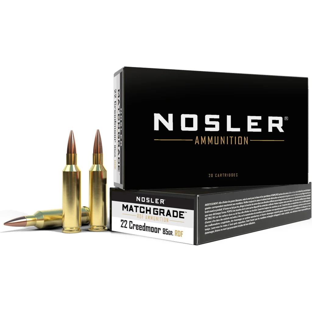 Nosler Match Grade Rifle Ammunition in 22 Creedmoor is precision-loaded with an 85-grain Hollow Point Boat Tail RDF bullet and Nosler Premium Brass for superior accuracy and performance. Designed for competitive shooting and precision long-range work, this match-grade round features a high ballistic coefficient of 0.498 (G1) and 0.245 (G7), ensuring minimal wind drift and a flat trajectory. The RDF bullet’s optimized boat-tail design and ultra-consistent hollow point tip contribute to exceptional aerodynamic efficiency and reliable point-of-impact consistency. With a muzzle velocity of 3175 feet per second and 2433 foot-pounds of energy, this ammunition delivers the precision and reliability demanded by elite marksmen.